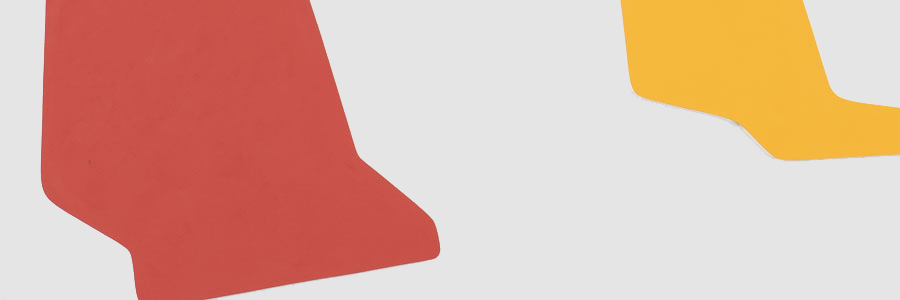 Prenons par exemple En attendant O. Que voit-on ? Trois shaped canvas aux angles arrondis, placés sur une ligne montante invisible pour dessiner une perspective. Blanc, rouge, jaune. En aplat. On comprend assez vite qu’il s’agit de sièges baquets en plastique moulé, ceux dont le design moderniste a été popularisé par Charles et Ray Eames dans les années 50. Ce genre de sièges que l’on trouve dans les salles d’attente des gares suisses ou des aéroports américains. Ceux sur lesquels on s’assied sans y faire attention tant ils font partie du mobilier urbain d’une époque.