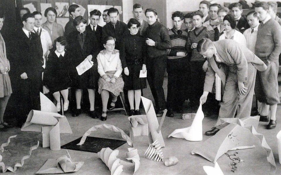 Albers avait un intérêt particulier pour le papier et conviait ses étudiants à explorer le potentiel structurel d’une simple feuille en la détournant de sa fonction ordinaire ; pour montrer par exemple, en quoi un matériau souple et malléable peut être rendu rigide par l’action du pliage. [8]